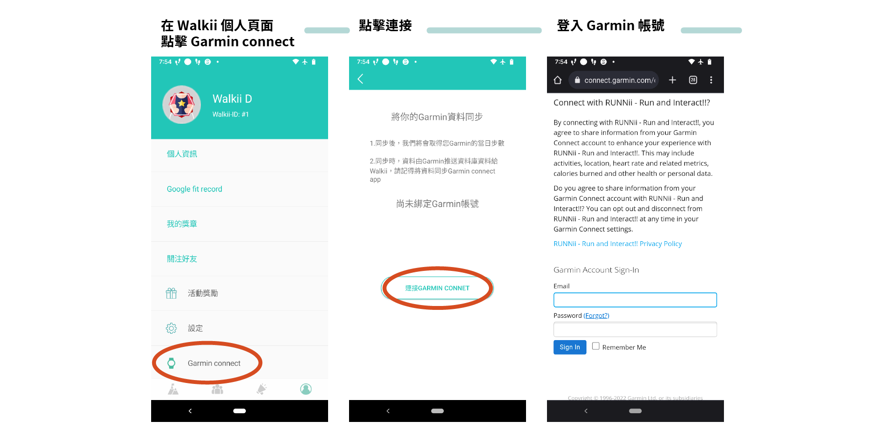 Walkii『個人頁面』=>『 Garmin connect 』=> 連結 => 登入使用 Garmin 帳號